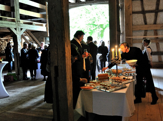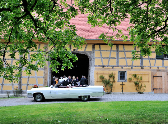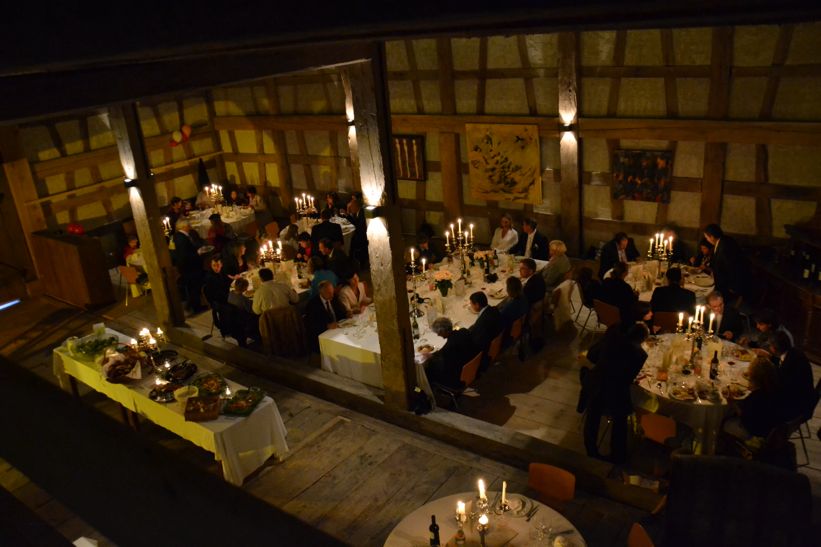 Die Schlossscheune wurde 2008 aufwendig restauriert und hat trotzdem ihren alten Charme einer Zehnter-Scheune behalten. Die aufwendige alte Fachwerkstruktur bildet einen wunderbaren Rahmen für einen rustikalen Abend bei lauen Nächten.