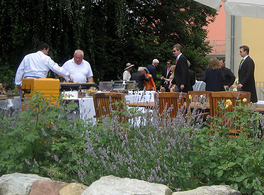 Hinter dem Schloss befindet sich die Schlossterrasse. Von hier aus geniessen Ihre Gäste einen herrlichen Blick über den Bodanrück, nach Überlingen und Heiligenberg sowie im Süden in die Alpenkette. Natürlichen Sonnenschutz spendet die alte Sommerlinde.